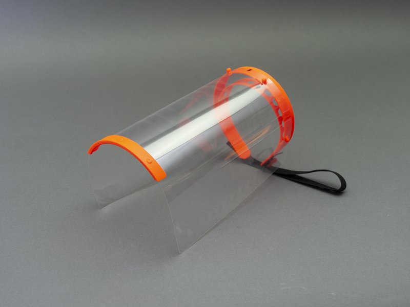 Prusa Protective Face Shield RC3 (website) — 3D printed parts and vinyl shield (shown at top right), dual headband spaces the shield away from your face. When printed in PETG, it can be sanitized chemically, with hot air, or UV-C.