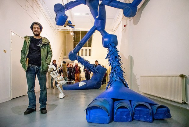 Dutch artist Jelle de Graaf gives new life to trash by using it to create his whimsical, large-scale creatures, sculptures, and installations. The blue creation at the top of this article will be prominently on display outside the Klokgebouw. Pictured here are him and other examples of his work.