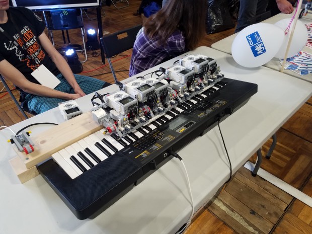 In the olden days, player pianos were created with rolls of paper that had holes in them that controlled which keys were pressed. This student-built player keyboard serenaded the crowd with a bevy of songs – including hits from Adele – and uses 7 Lego Mindstorms controllers.