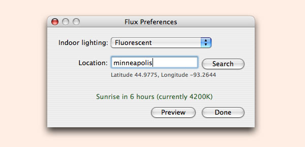 In the preferences, you specify the type of ambient lighting (fluorescent, halogen, etc.) and your location. F.lux then adjusts the brightness and temperature of the display throughout the day to be appropriate for the particular time. If you preview the difference, it looks noticeable. In use, though, the change happens so gradually that you don’t really notice the colors are shifting.