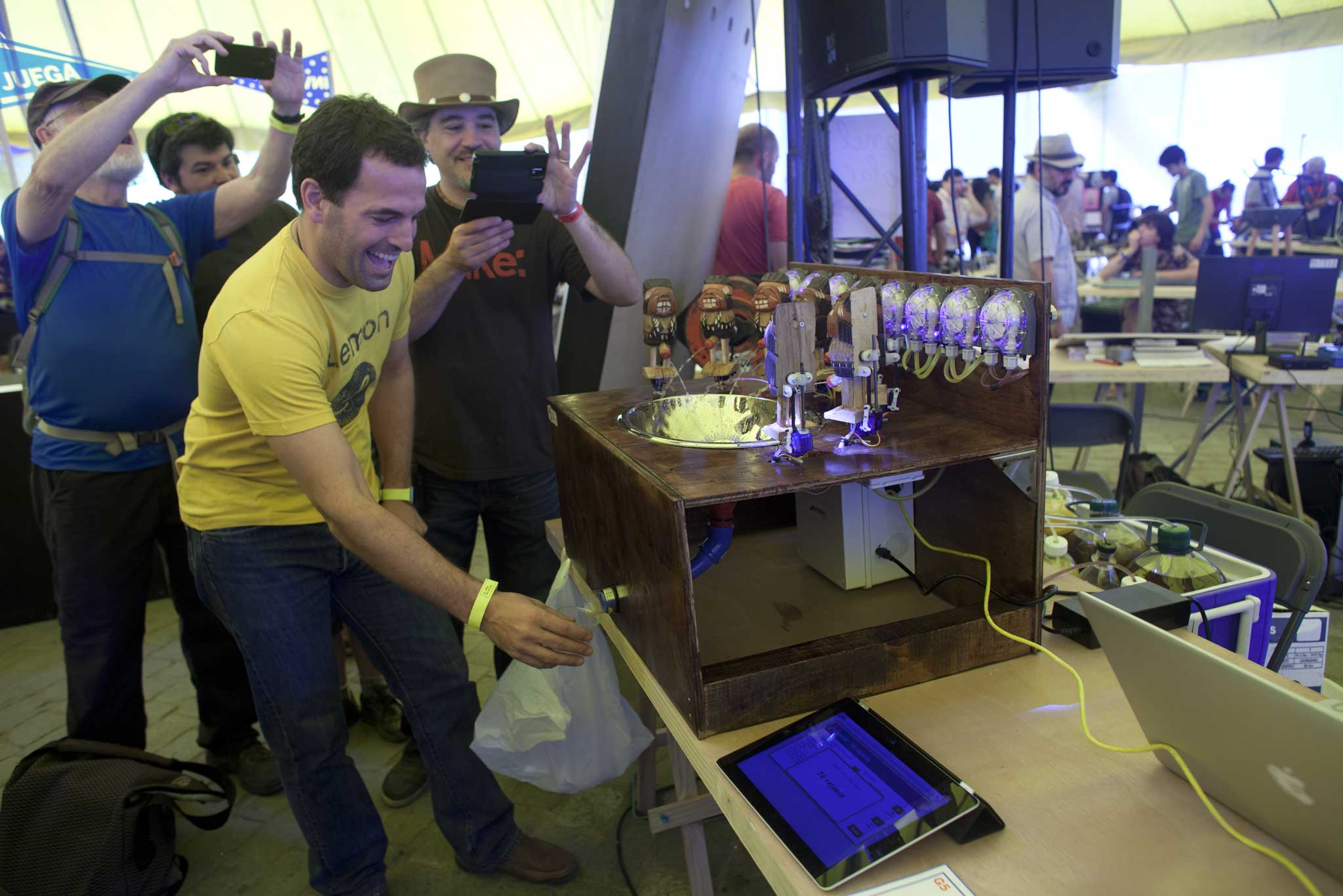 The Indio Pícaro doll is a national joke in Chile, one which Nathan Pahucki and Pablo Castro wanted to capitalize on at the Santiago Mini Maker Faire. Their project, PissCO, is a robotic drink machine in which each Indian doll… well… dispenses a particular drink ingredient. The user chooses their drink from a tablet which is connected to a Raspberry Pi-based web server. The Raspberry Pi, in turn, controls the servo motors and peristaltic pumps to dispense the drink according to its recipe.