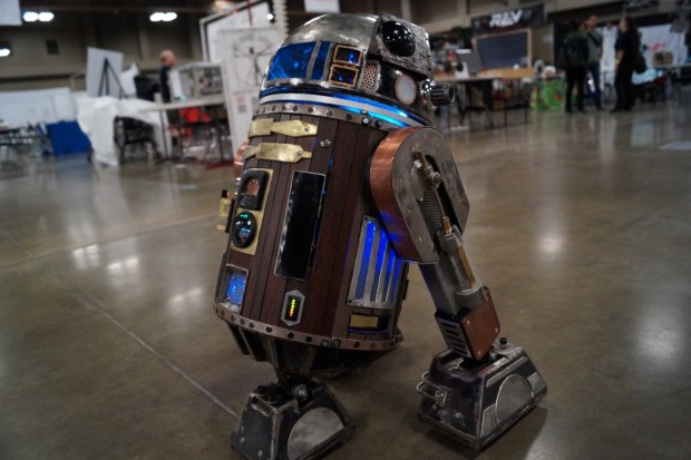 Wandering around Maker Faire Austin, I stumbled upon quite a unique little droid. This half-sized R2 D2 unit was rolling around, beeping and booping as R2 units tend to do, but immediately caught my attention with its steampunk style.