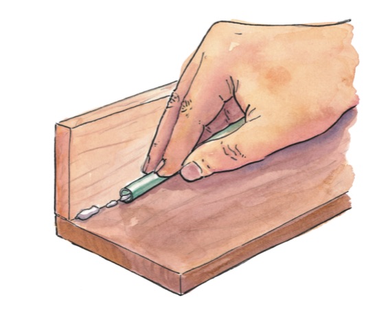 There are many techniques for, and much debate over, how to deal with squeeze-out, the excess glue that squishes out from two bonded workpieces. Trying to remove squeeze-out from an inside corner can be especially challenging. This tip from WoodSmithTips shows a clever way of using a plastic drinking straw to scoop up squeeze-out from inside corners.[Watercolor by Richard Sheppard]